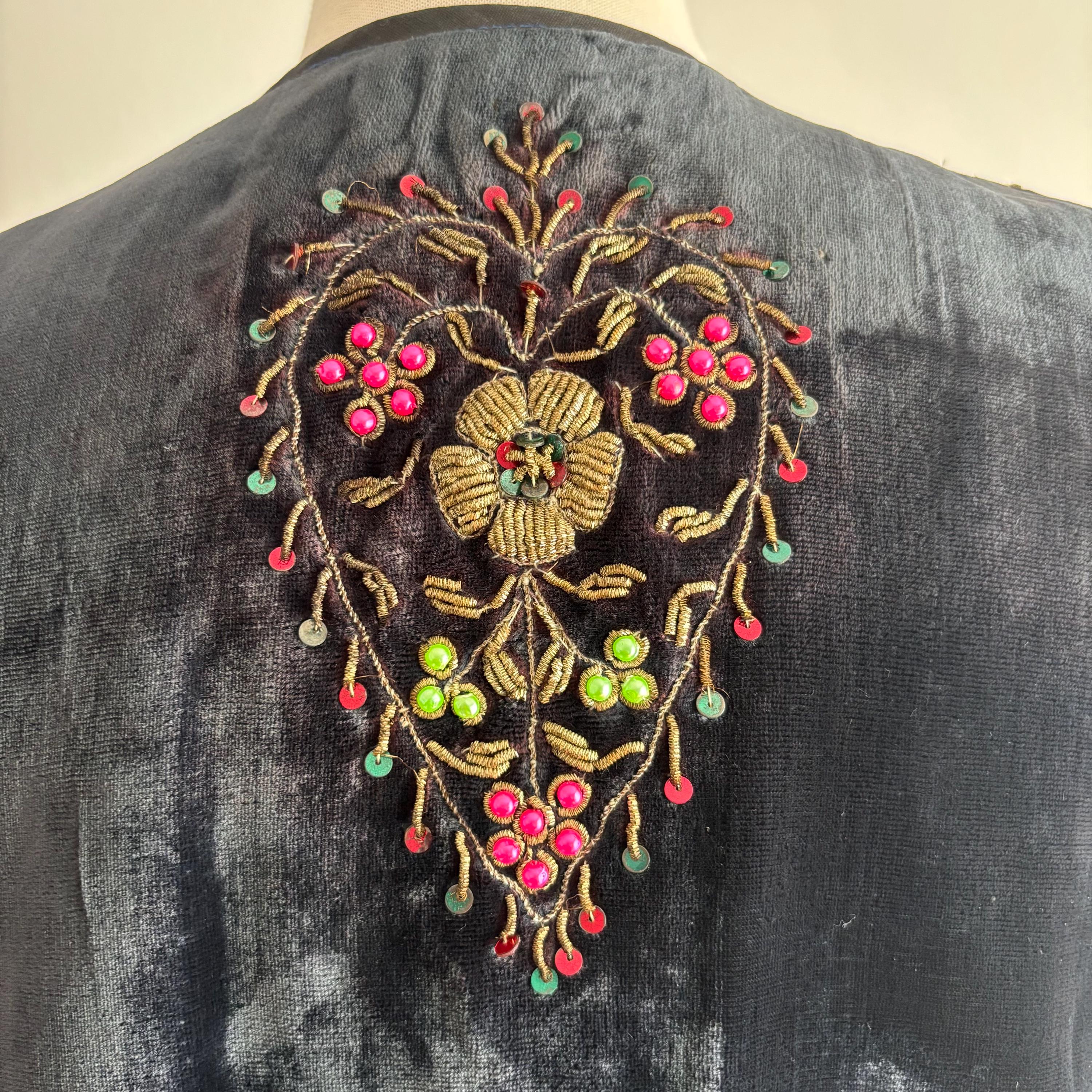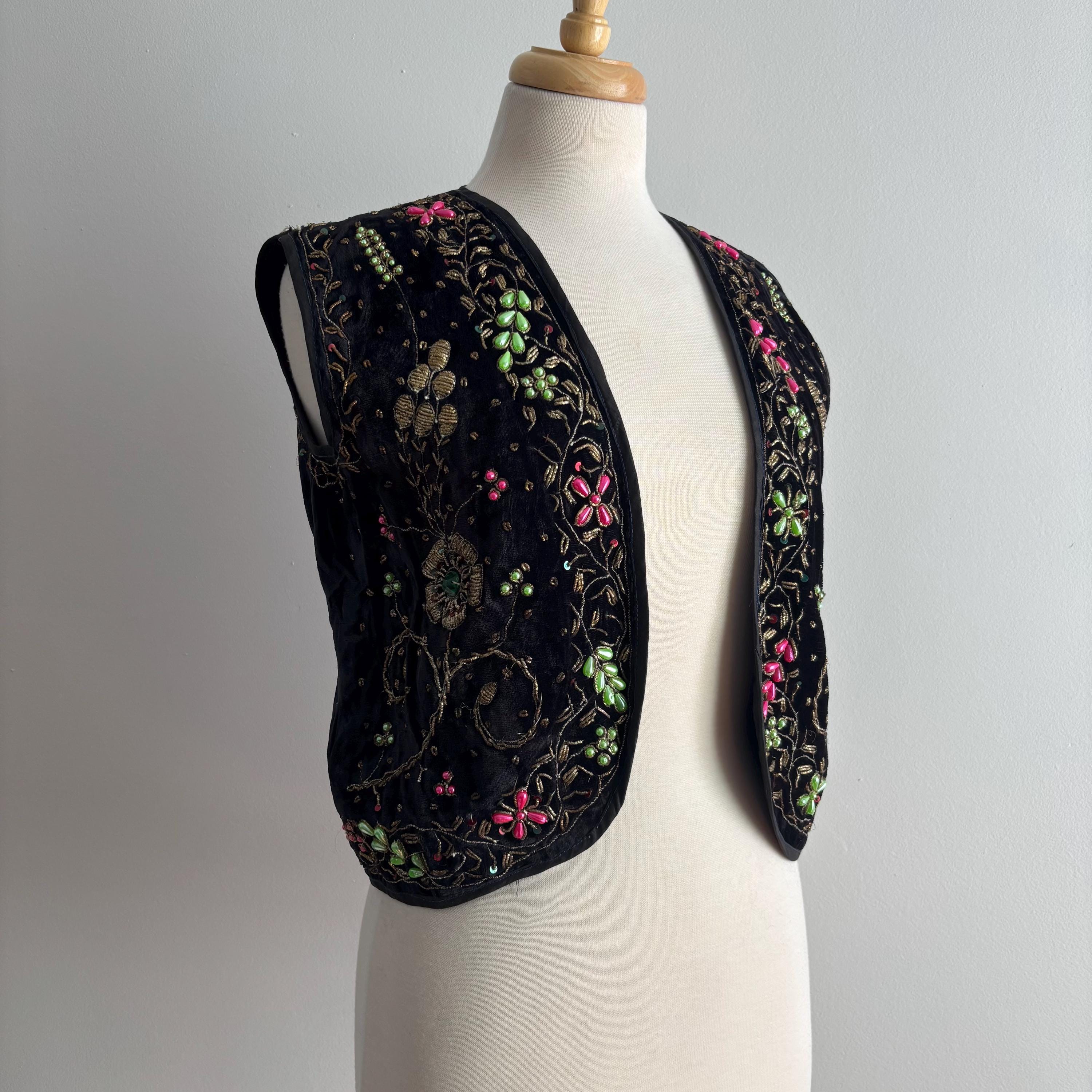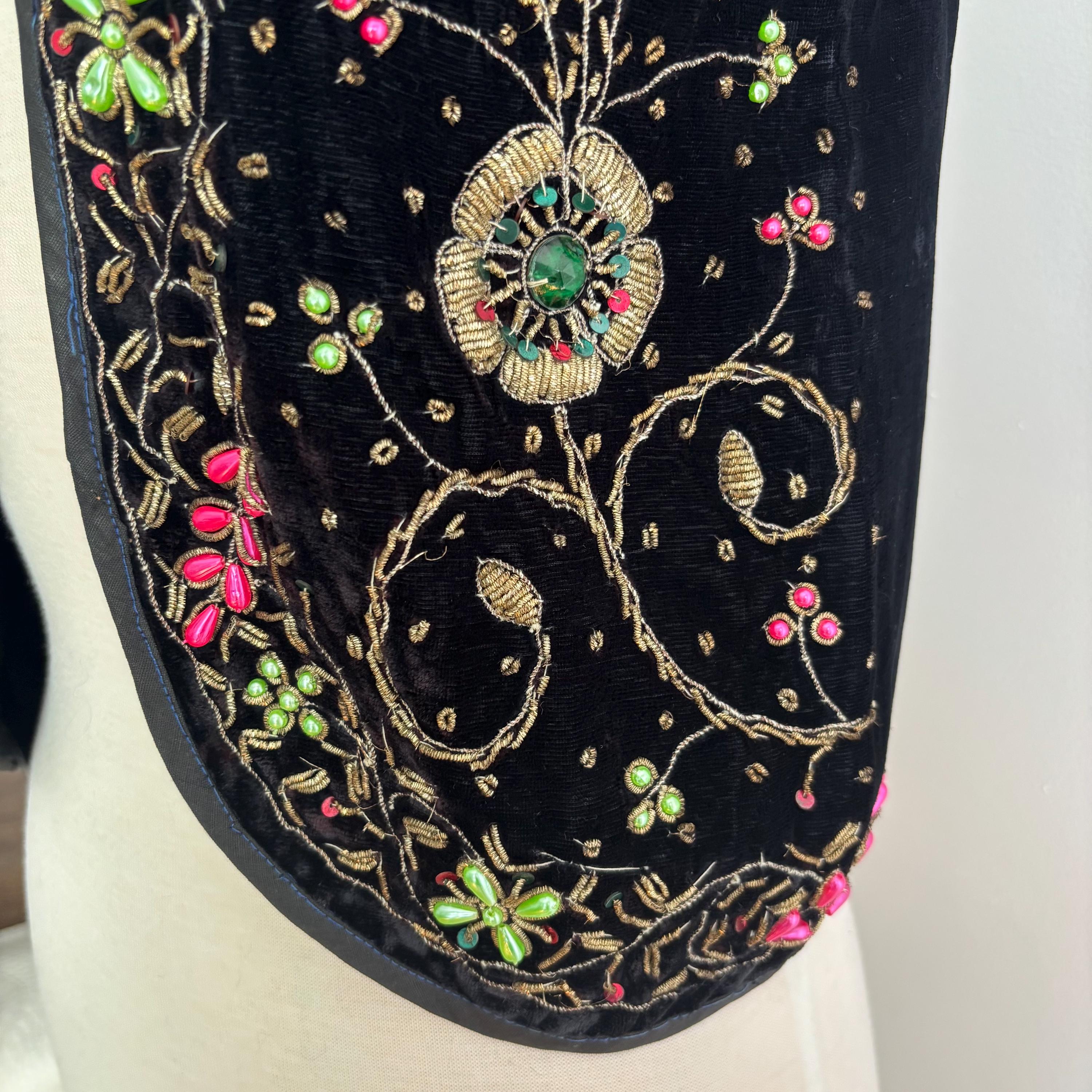 A really beautiful velvet vest, richly decorated with golden embroidery, pearlescent pink and green beads, sequins and faceted jewel-like beads. The vest is lined in a very lightweight black fabric, almost like a muslin. Absolutely stunning! The vest came to me with several other pieces that originated in the early mid-century era, but I cannot pinpoint the age of this one. Kismet, made in India. Please see the measurements for best fit.