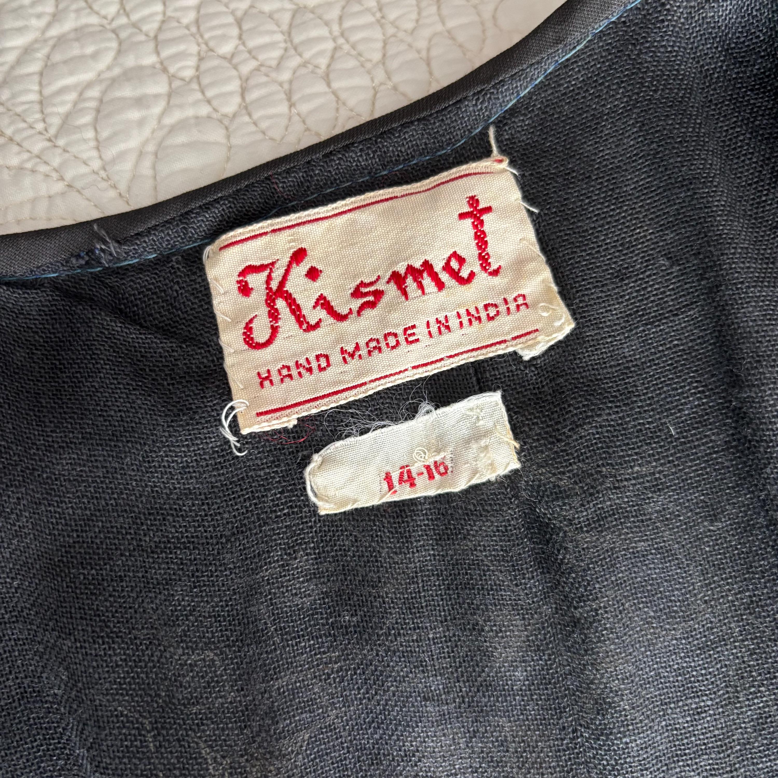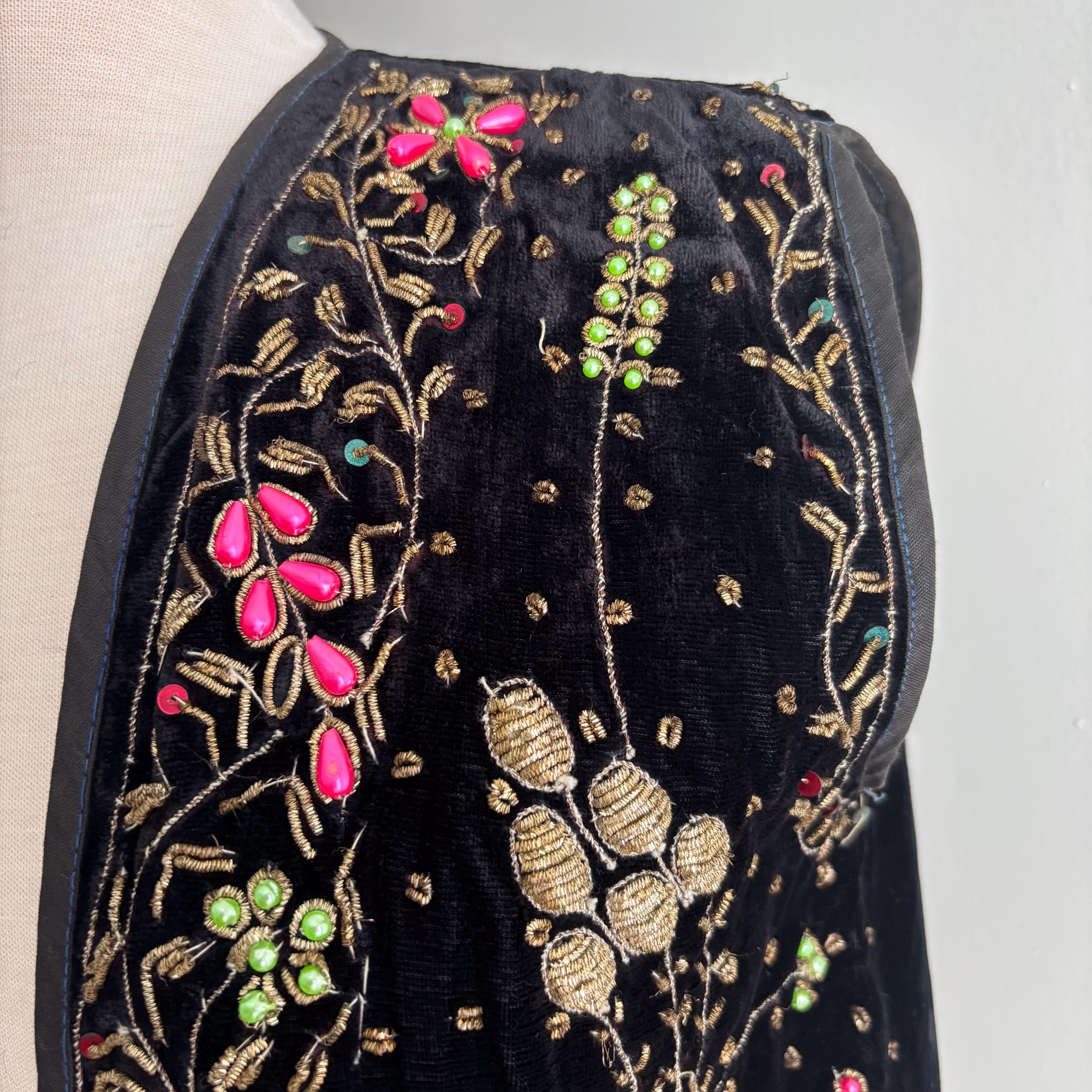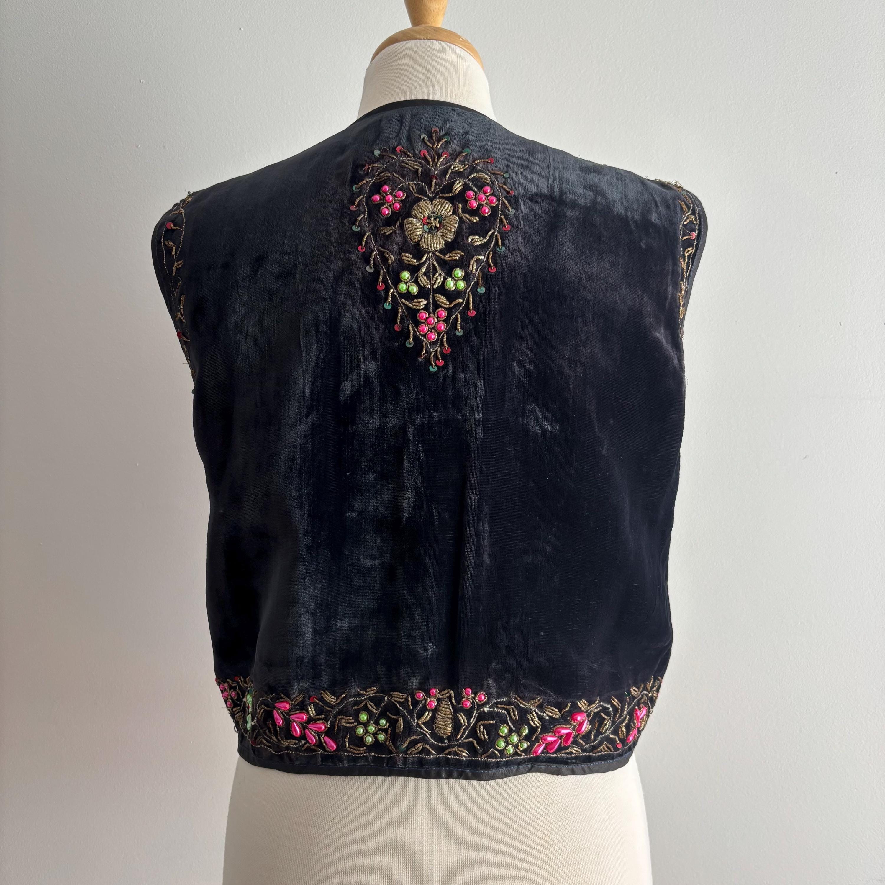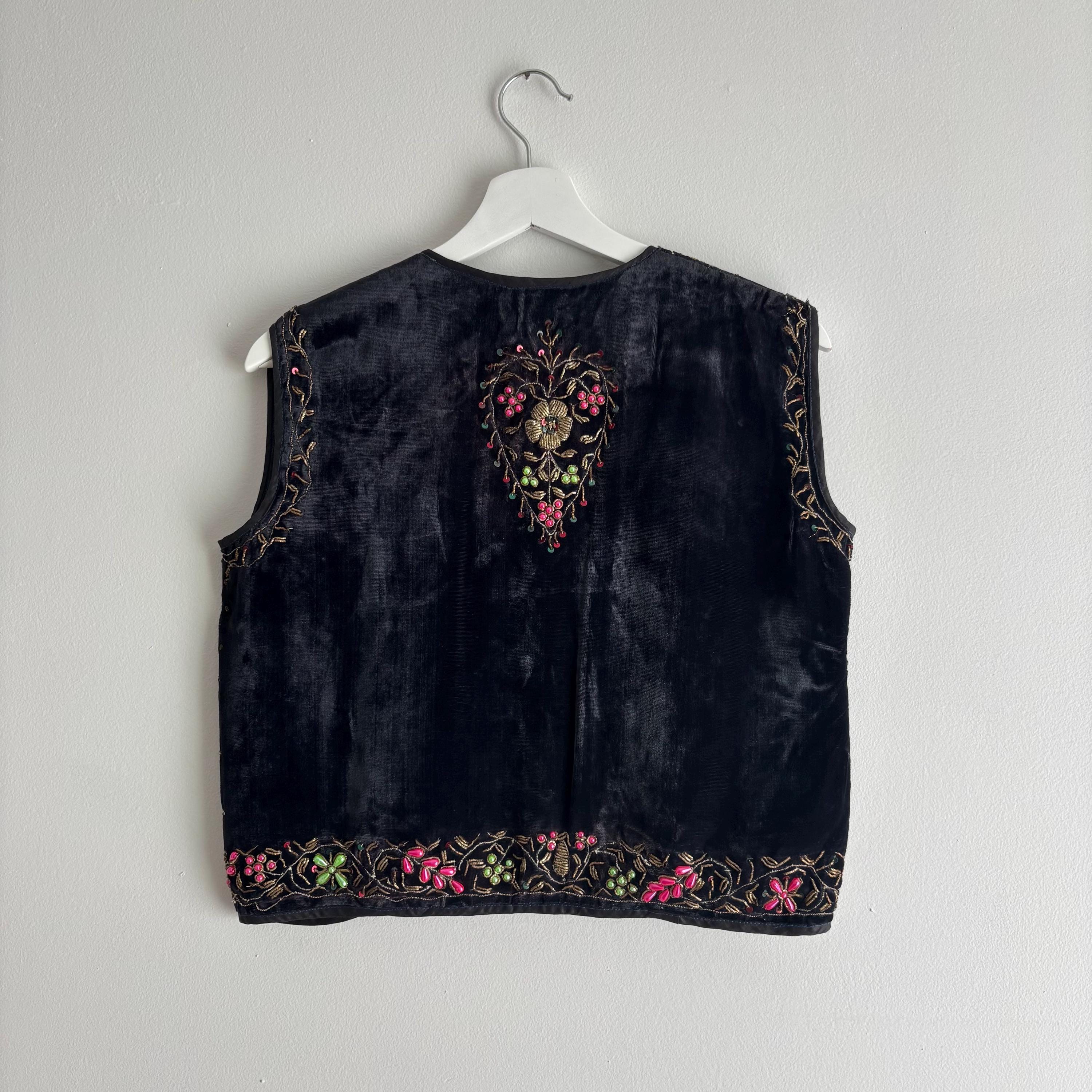 A really beautiful velvet vest, richly decorated with golden embroidery, pearlescent pink and green beads, sequins and faceted jewel-like beads. The vest is lined in a very lightweight black fabric, almost like a muslin. Absolutely stunning! The vest came to me with several other pieces that originated in the early mid-century era, but I cannot pinpoint the age of this one. Kismet, made in India. Please see the measurements for best fit.