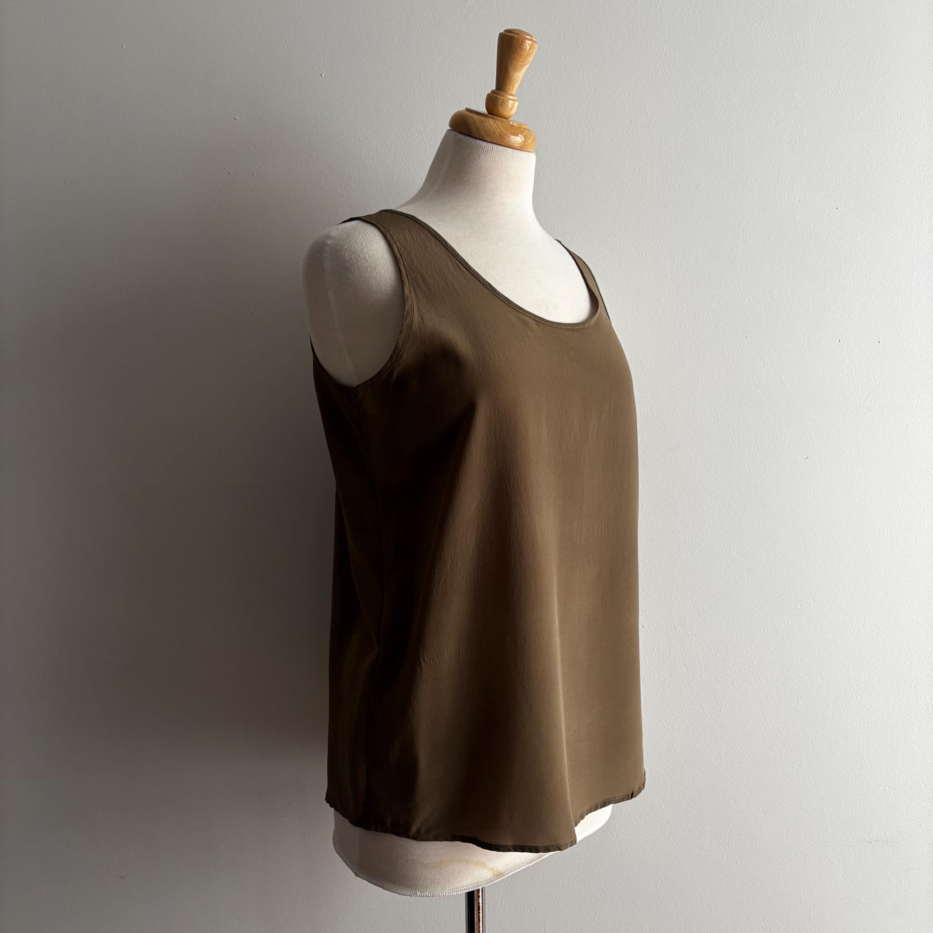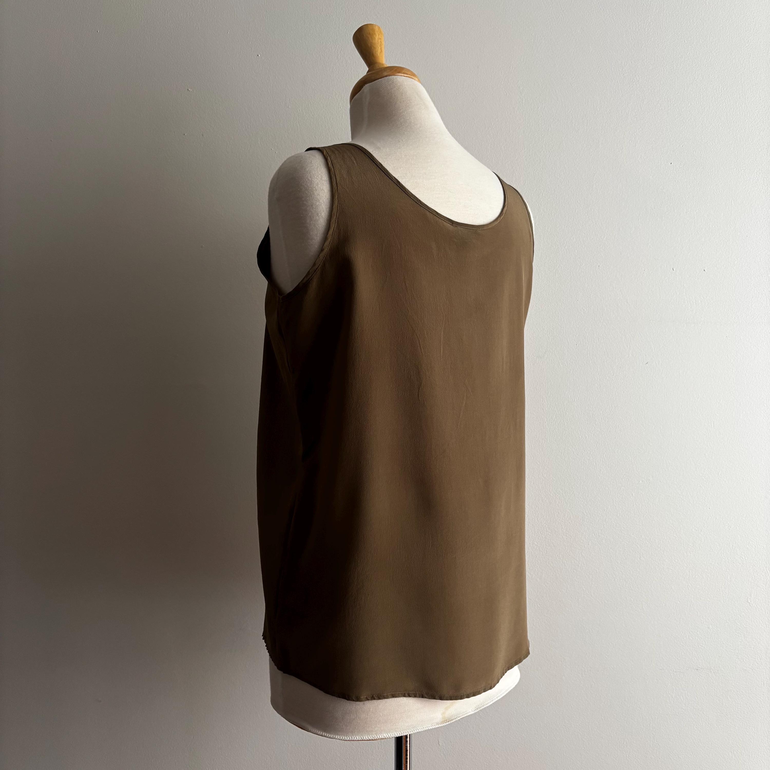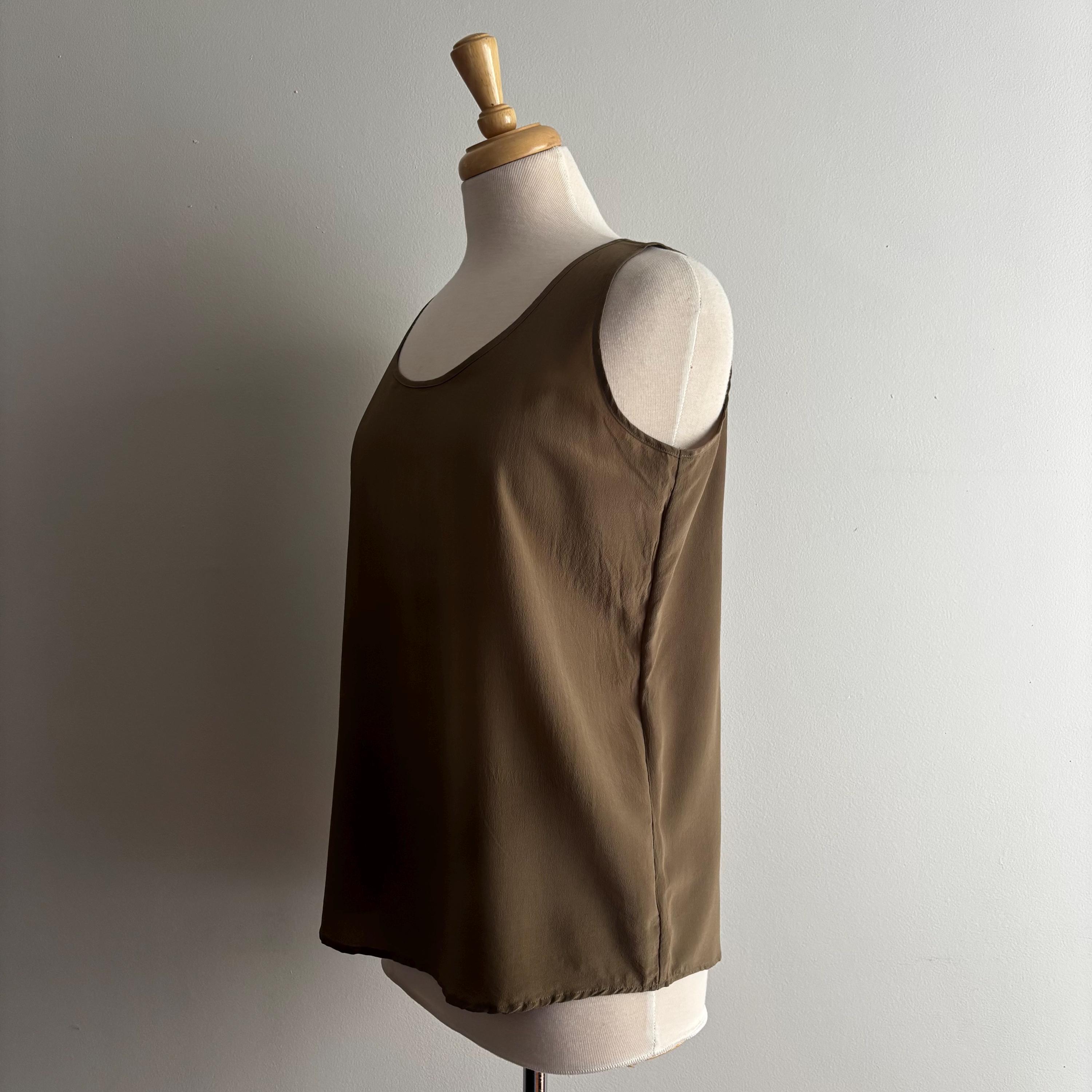 A beautiful vintage wardrobe staple. These are the sorts of pieces that I'm always hunting for myself. Simple, minimalist, natural fibres... this is a 100% silk, sleeveless top in a nice brown/olive tone. Wear in cooler weather under sweaters and cardigans. Easy and airy for hotter days! 100% silk, made in Hong Kong. Size medium, please see the measurements for best fit.