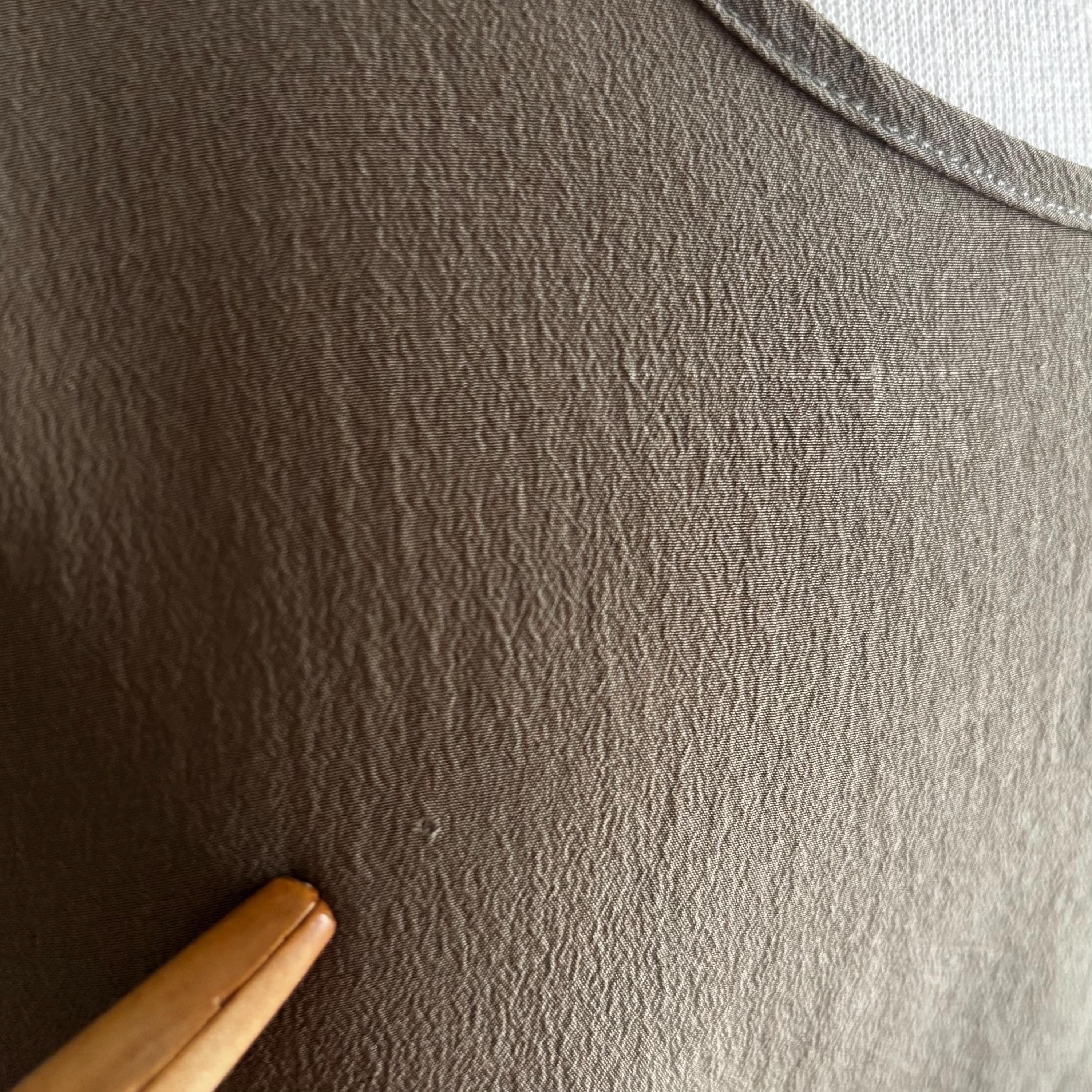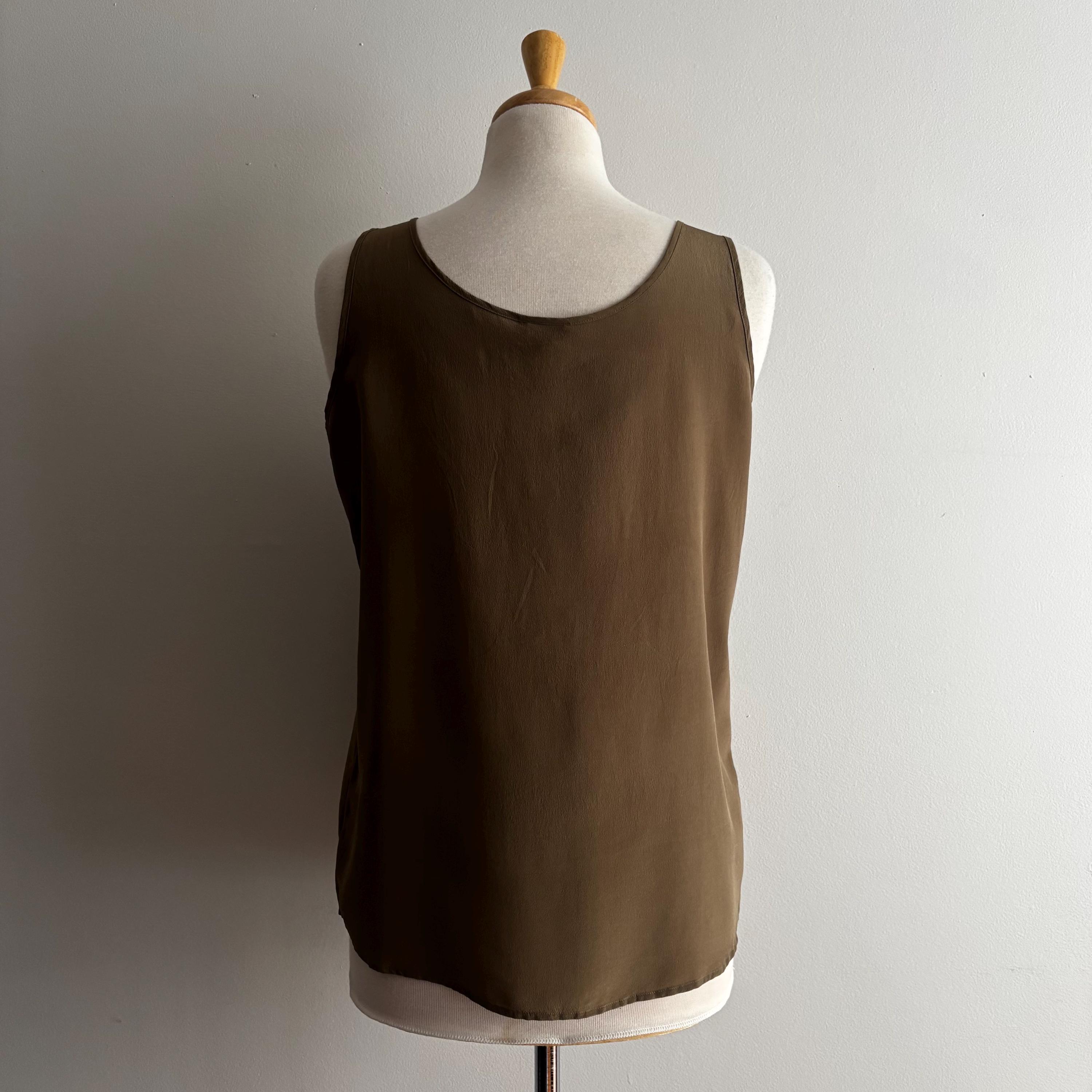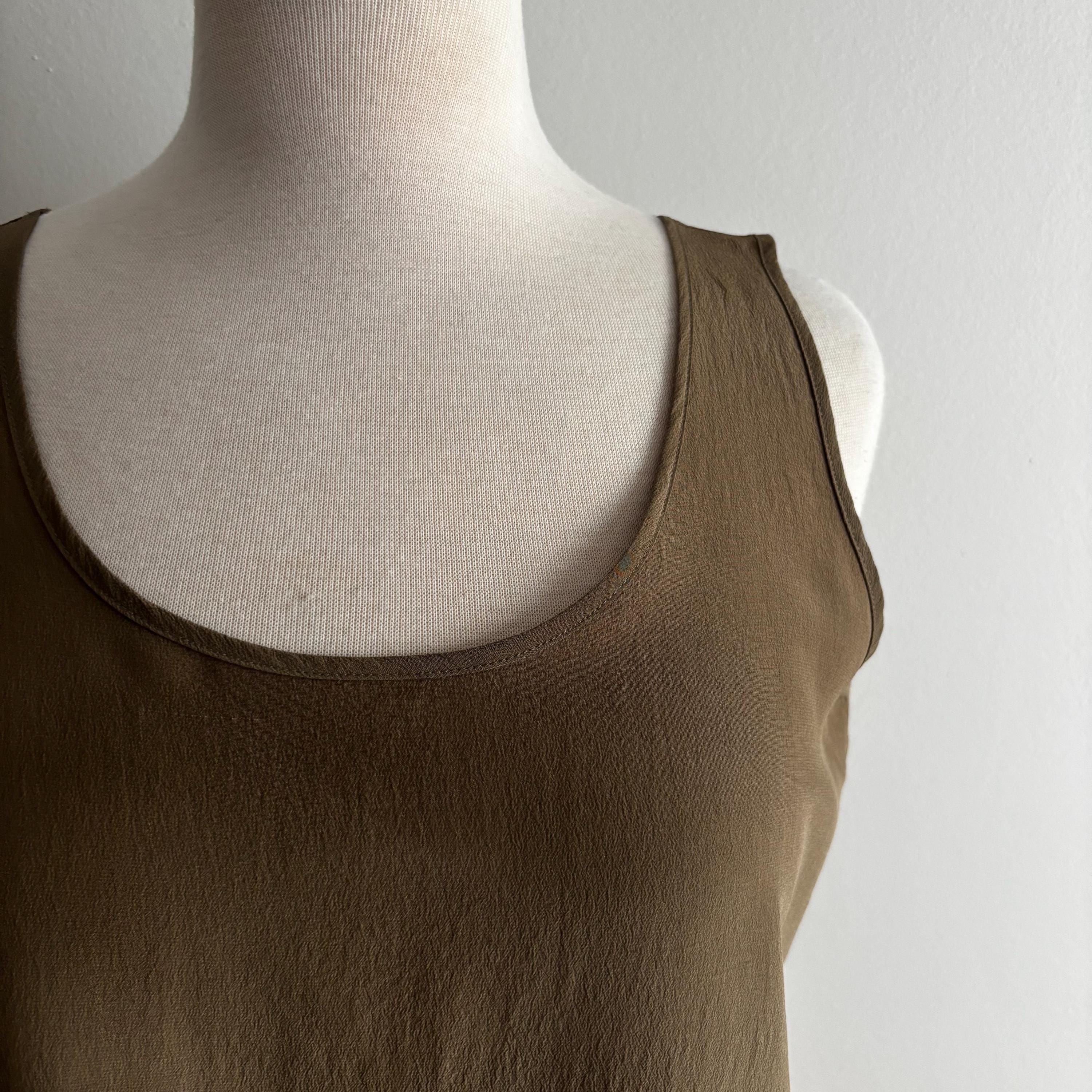 A beautiful vintage wardrobe staple. These are the sorts of pieces that I'm always hunting for myself. Simple, minimalist, natural fibres... this is a 100% silk, sleeveless top in a nice brown/olive tone. Wear in cooler weather under sweaters and cardigans. Easy and airy for hotter days! 100% silk, made in Hong Kong. Size medium, please see the measurements for best fit.