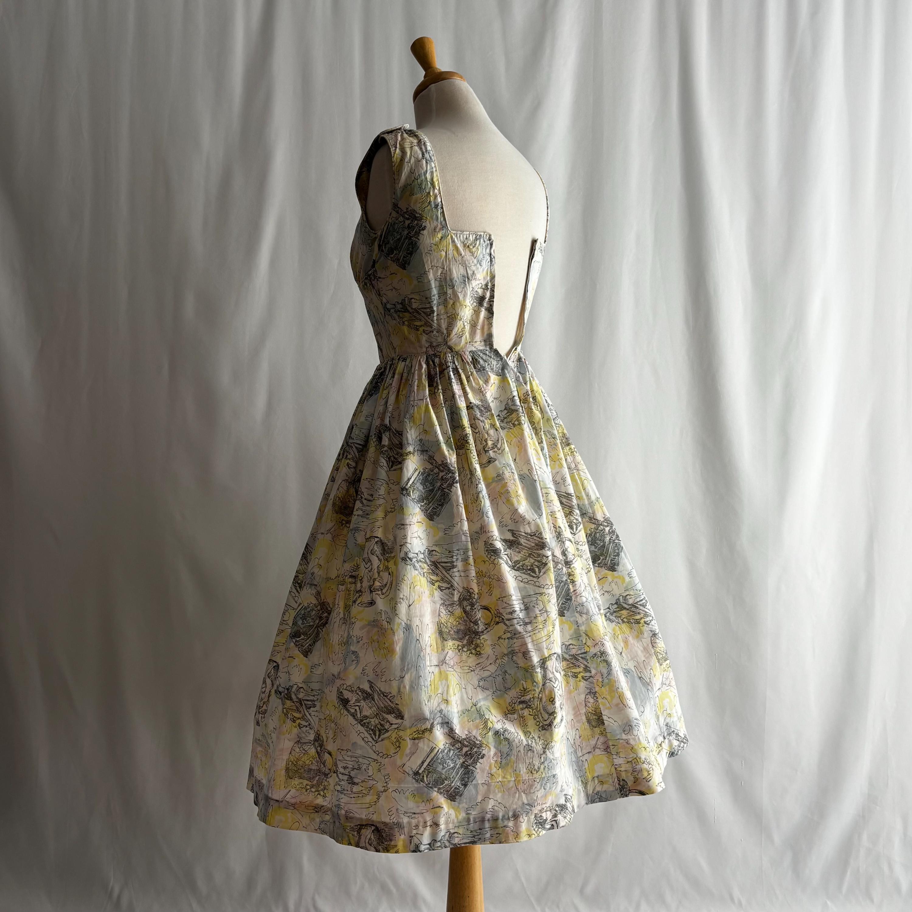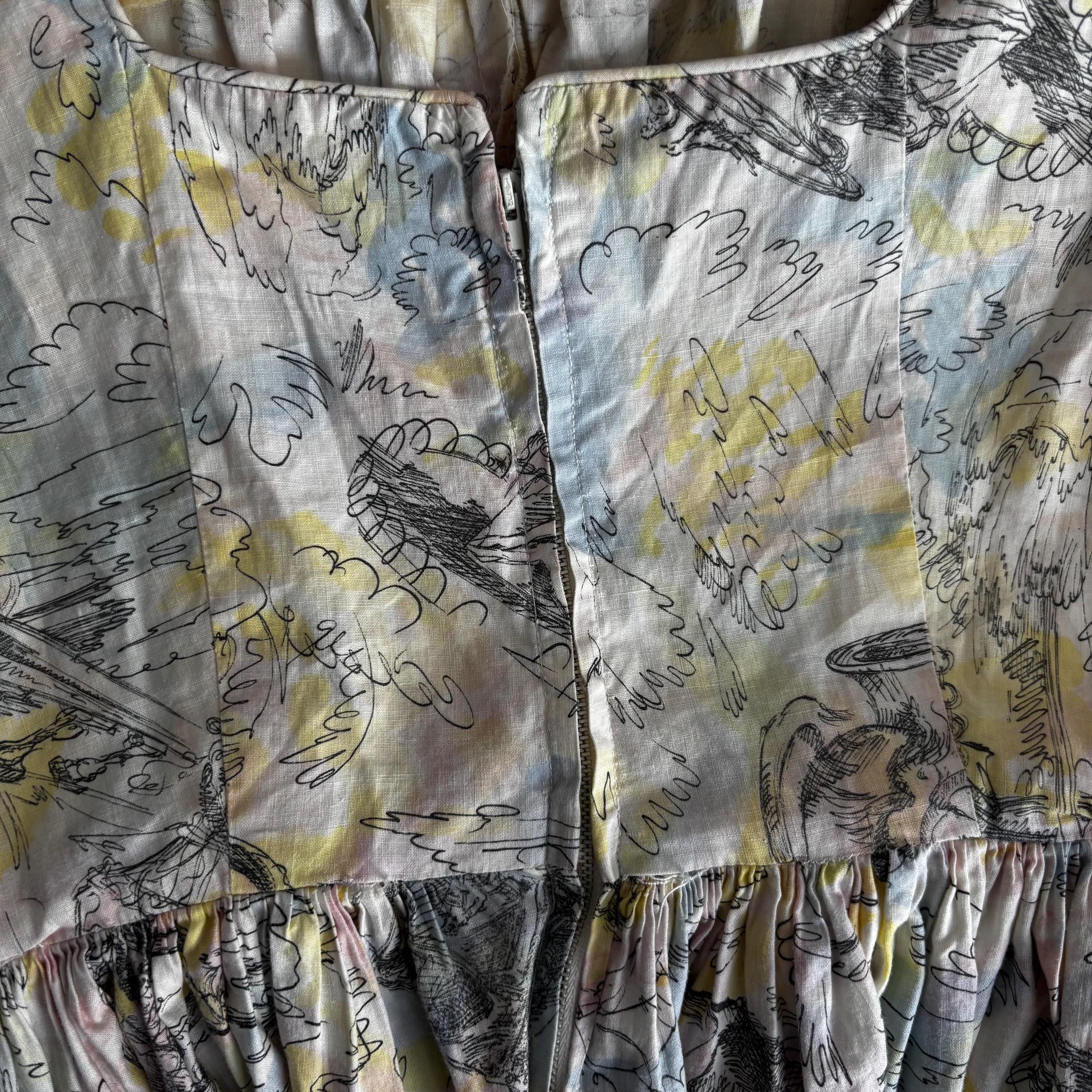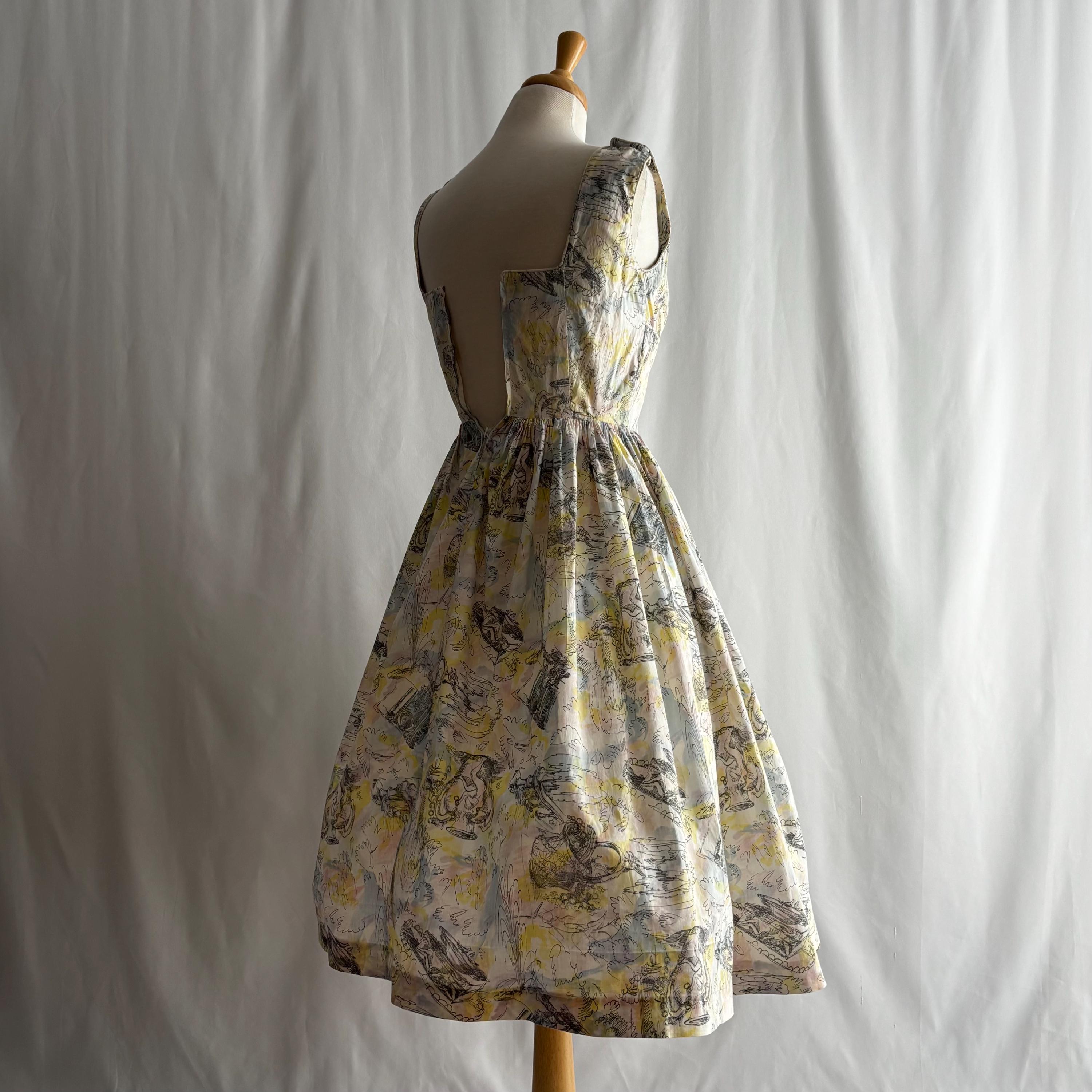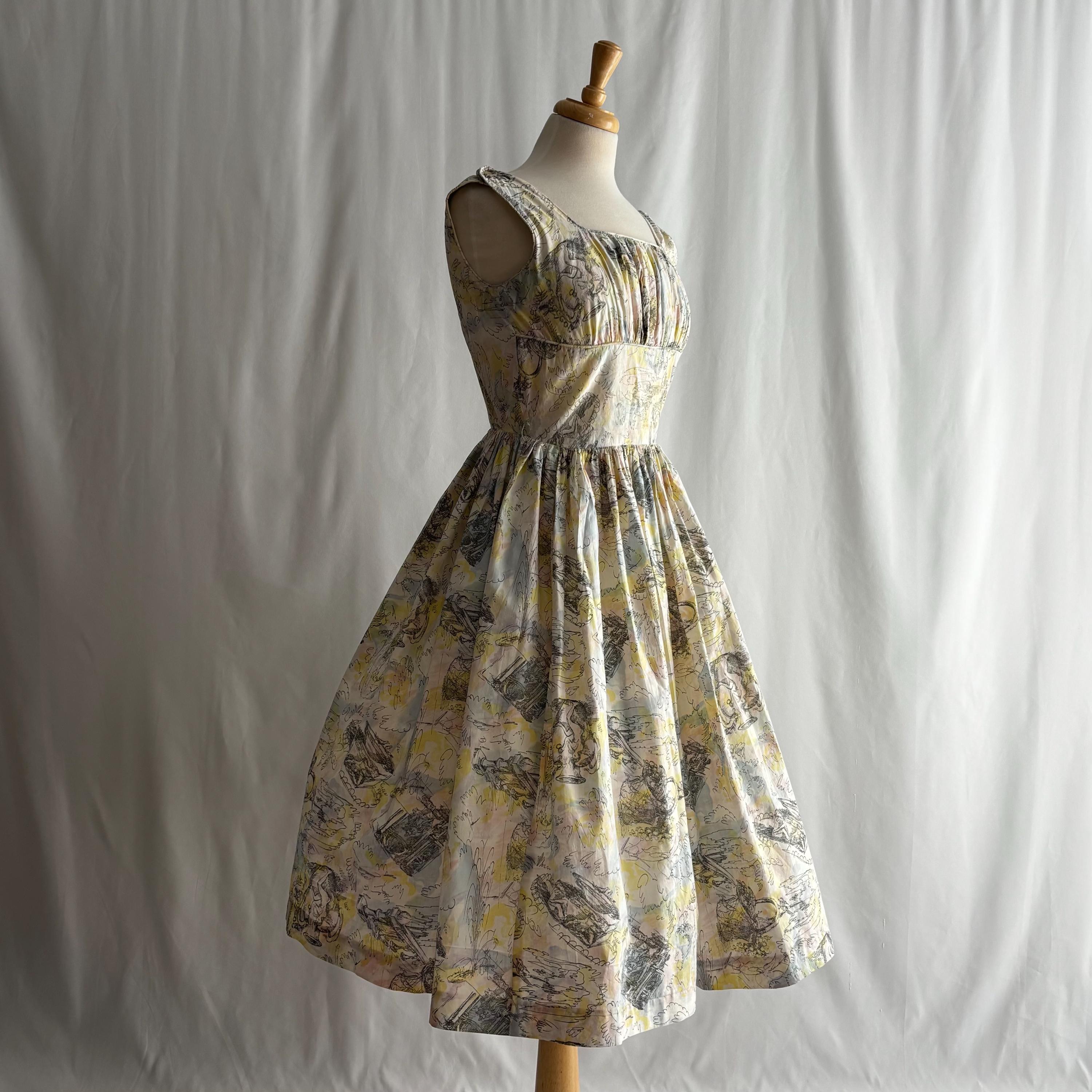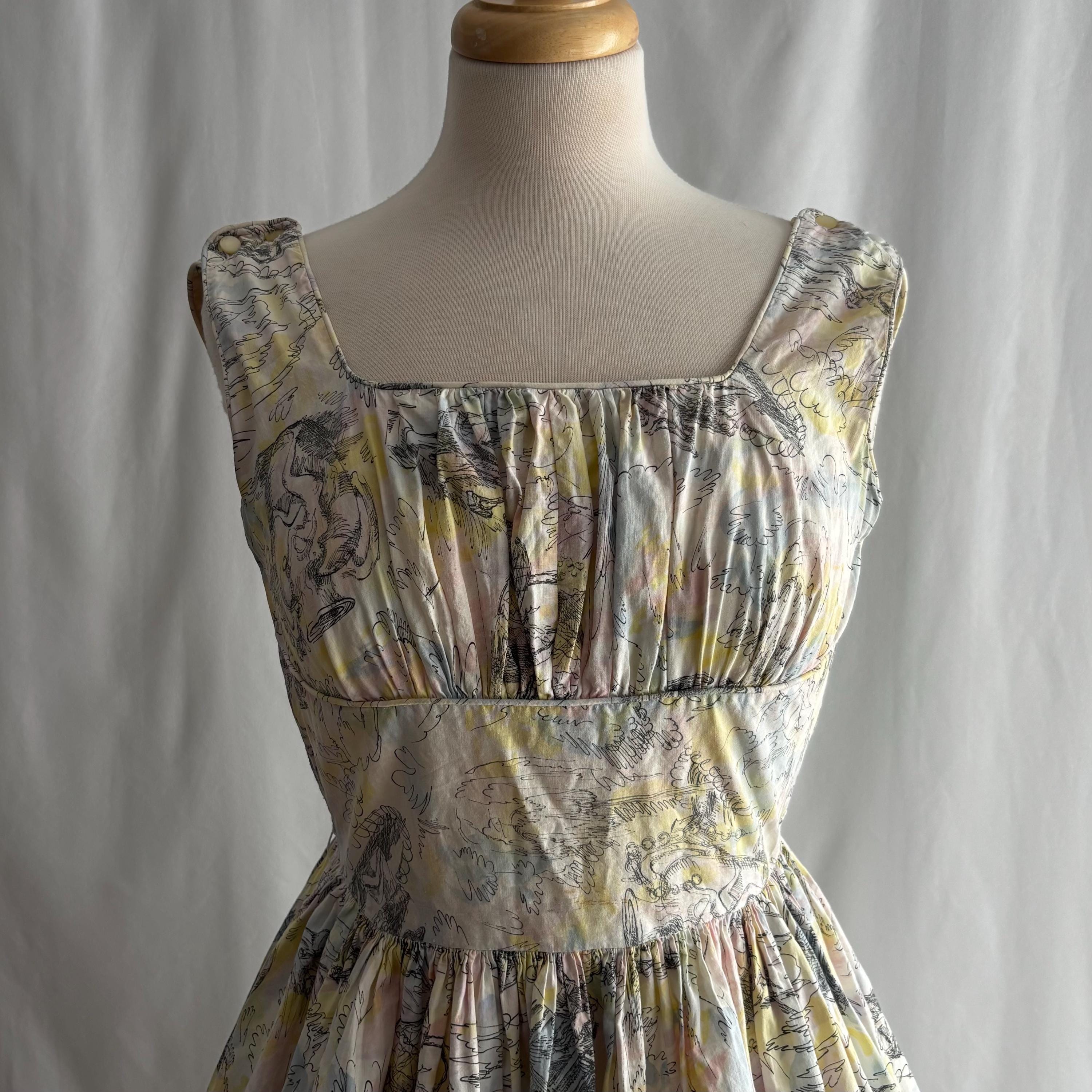 A really special 1960s vintage dress! Even without the incredible print, the dress is stunning. Starting at the top... the shoulders each have two buttons to close. The gathered bust sits atop an empire waist, with a snug fit through the body to the true waist. The skirt gathers at the waist and falls to roughly below knee length. I have pictured it here with a petticoat (not included) for volume. The dress closes at the back with a metal zipper and hook and eye. But the print! The fabric feels like cotton, and features a pink, blue and yellow pastel watercolour swirl, with sketches of Mediterranean scenes. Buildings, fountains, pottery and more. An absolute treasure! Please see the measurements for best fit.