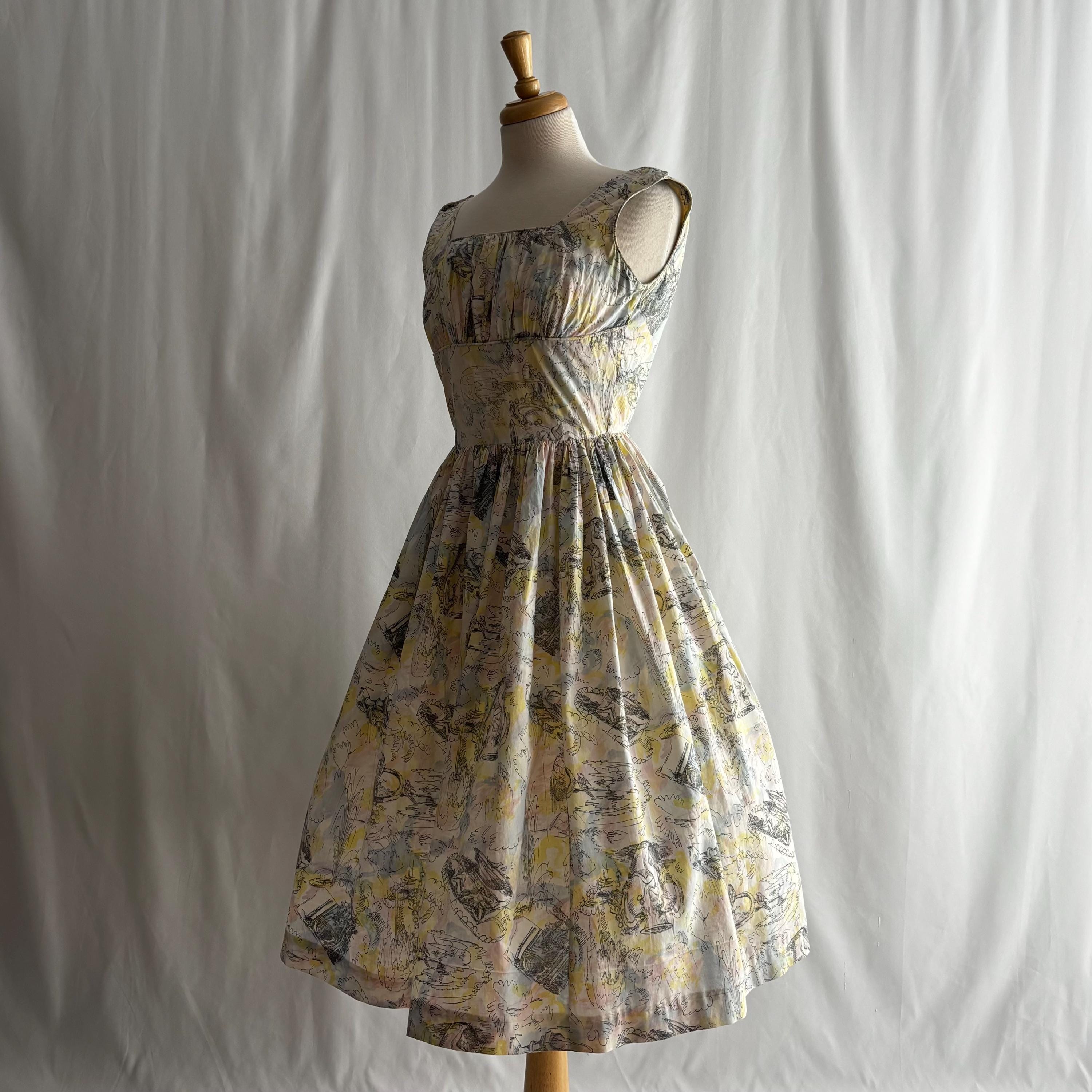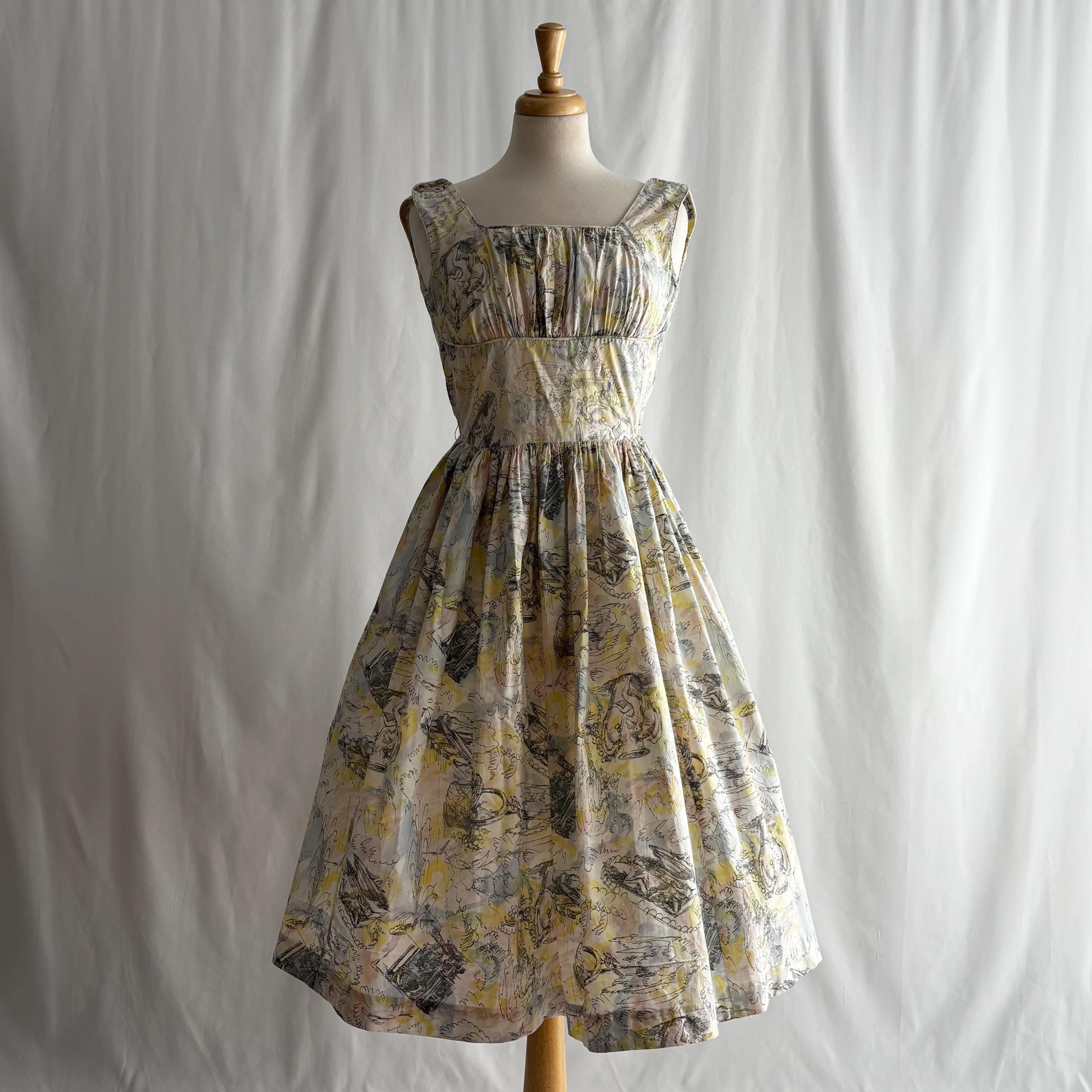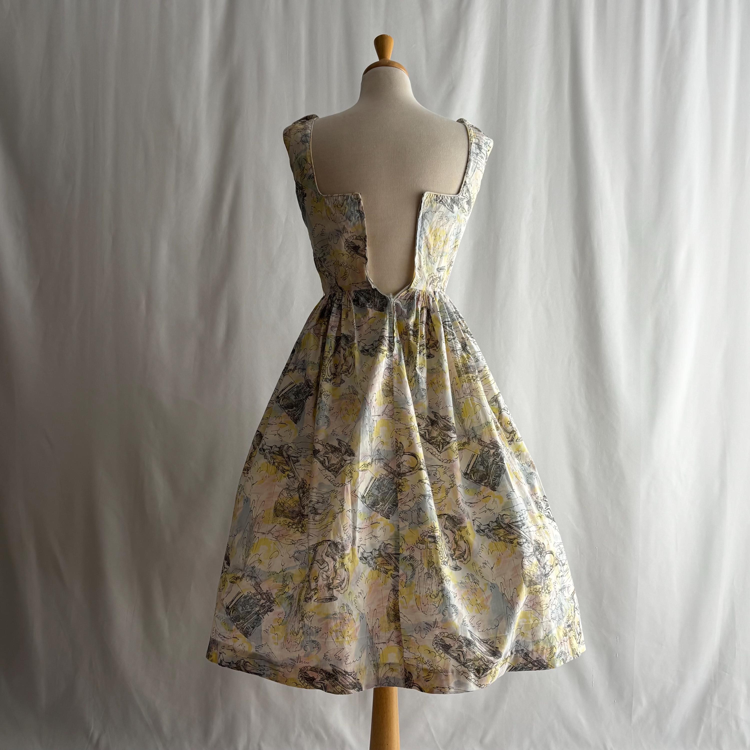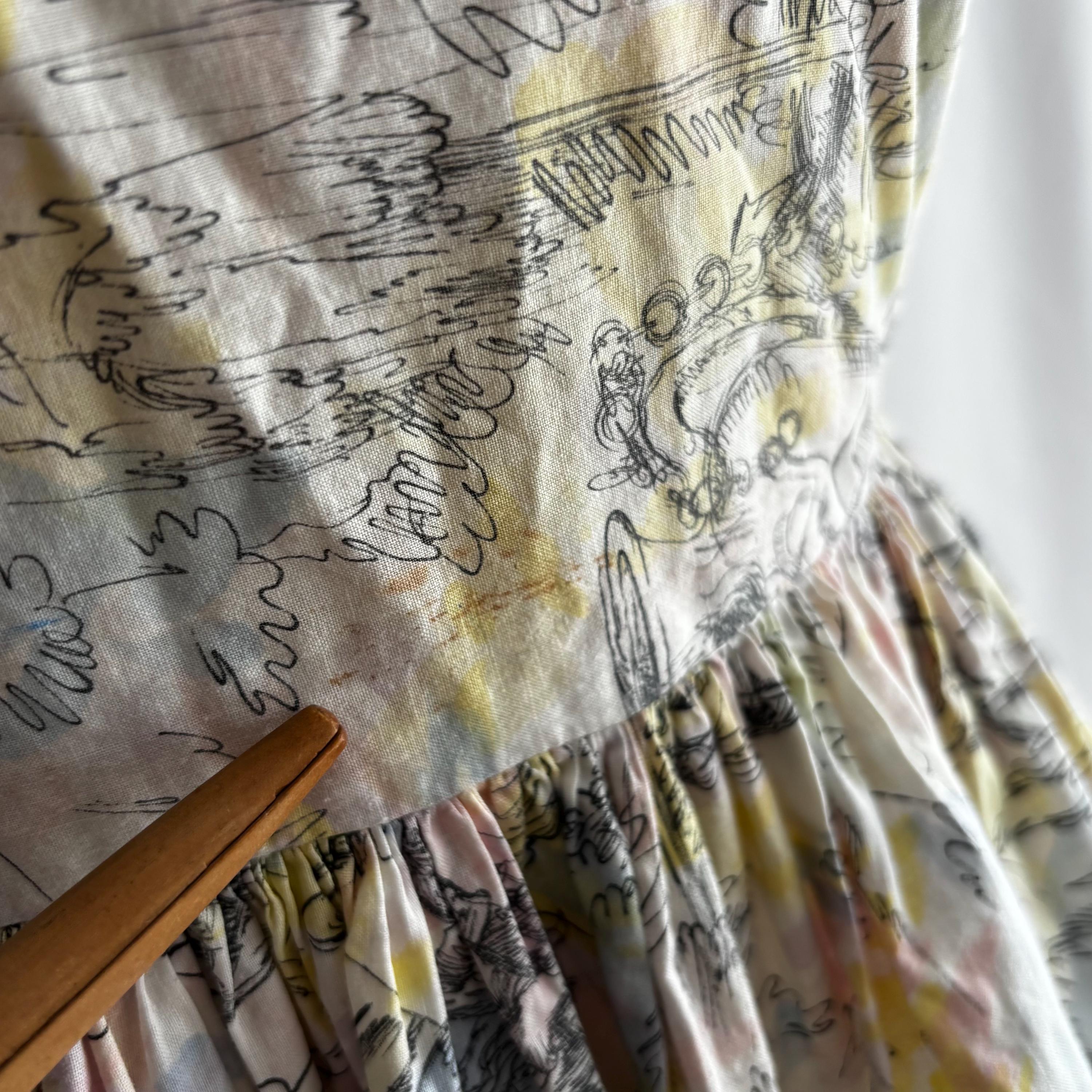 A really special 1960s vintage dress! Even without the incredible print, the dress is stunning. Starting at the top... the shoulders each have two buttons to close. The gathered bust sits atop an empire waist, with a snug fit through the body to the true waist. The skirt gathers at the waist and falls to roughly below knee length. I have pictured it here with a petticoat (not included) for volume. The dress closes at the back with a metal zipper and hook and eye. But the print! The fabric feels like cotton, and features a pink, blue and yellow pastel watercolour swirl, with sketches of Mediterranean scenes. Buildings, fountains, pottery and more. An absolute treasure! Please see the measurements for best fit.
