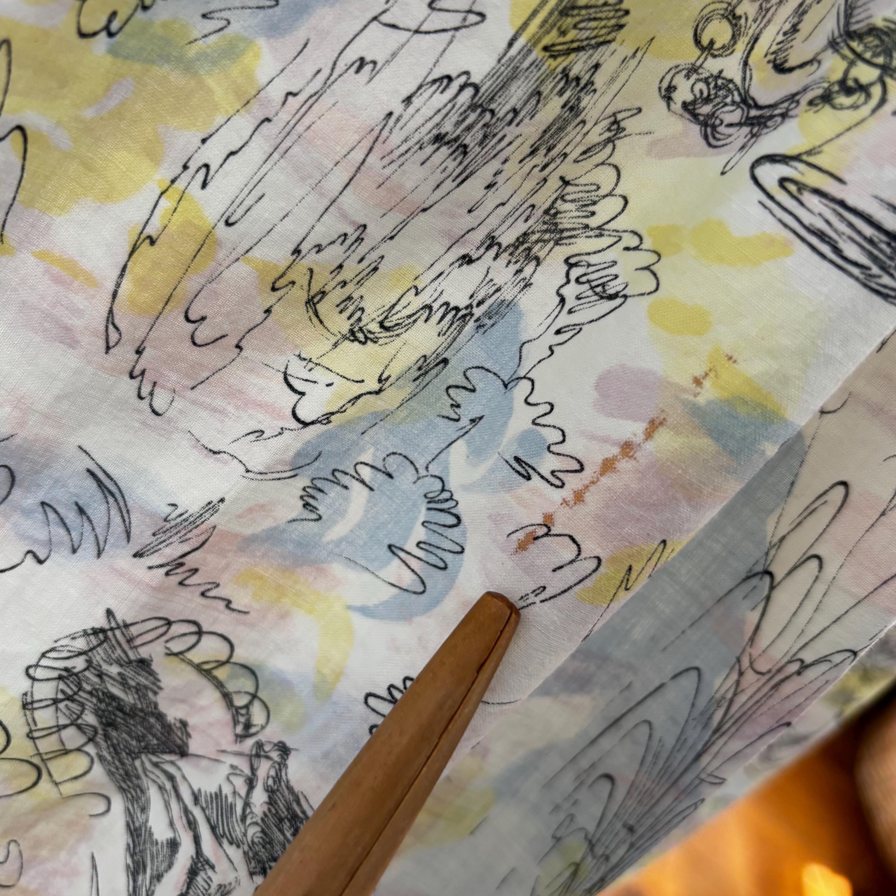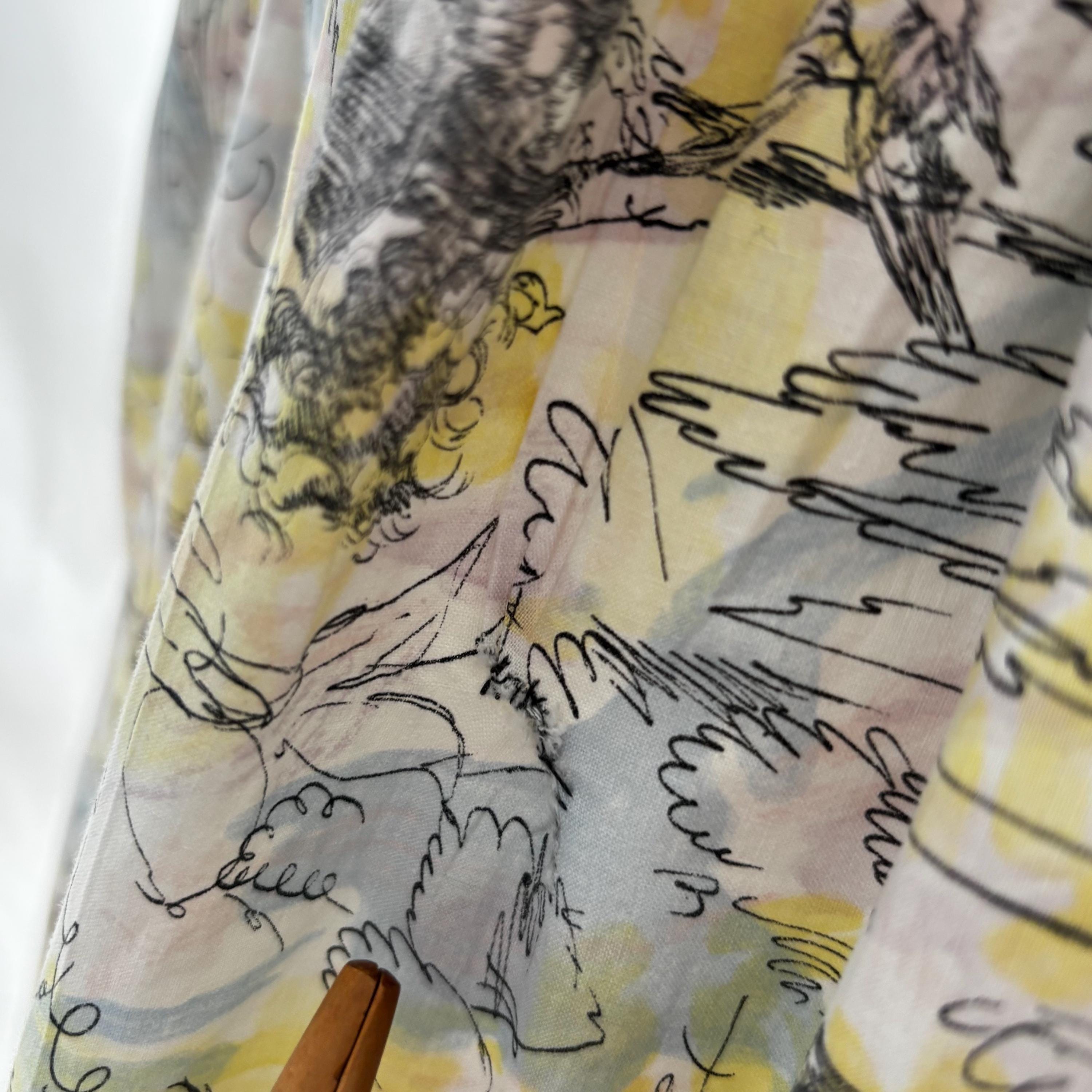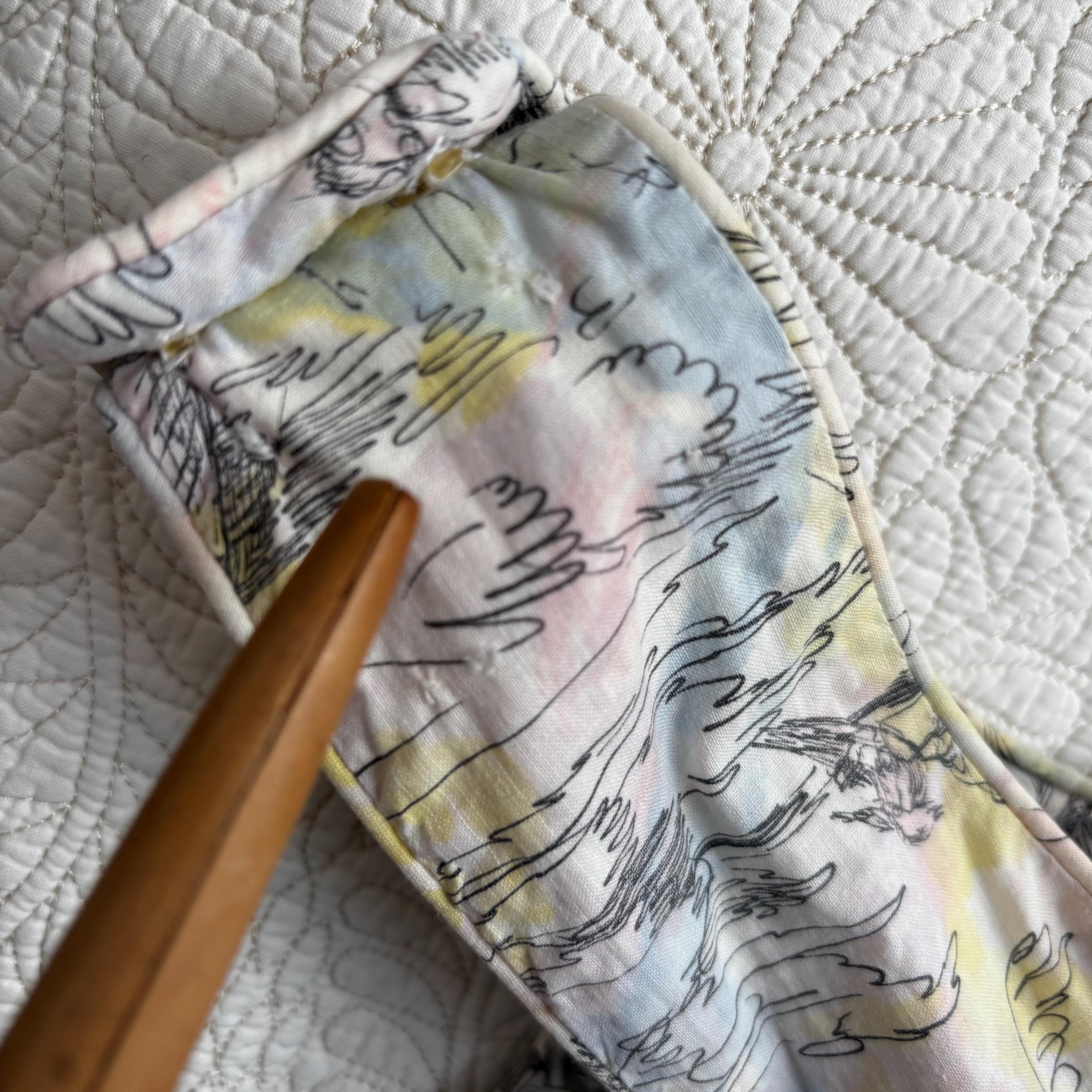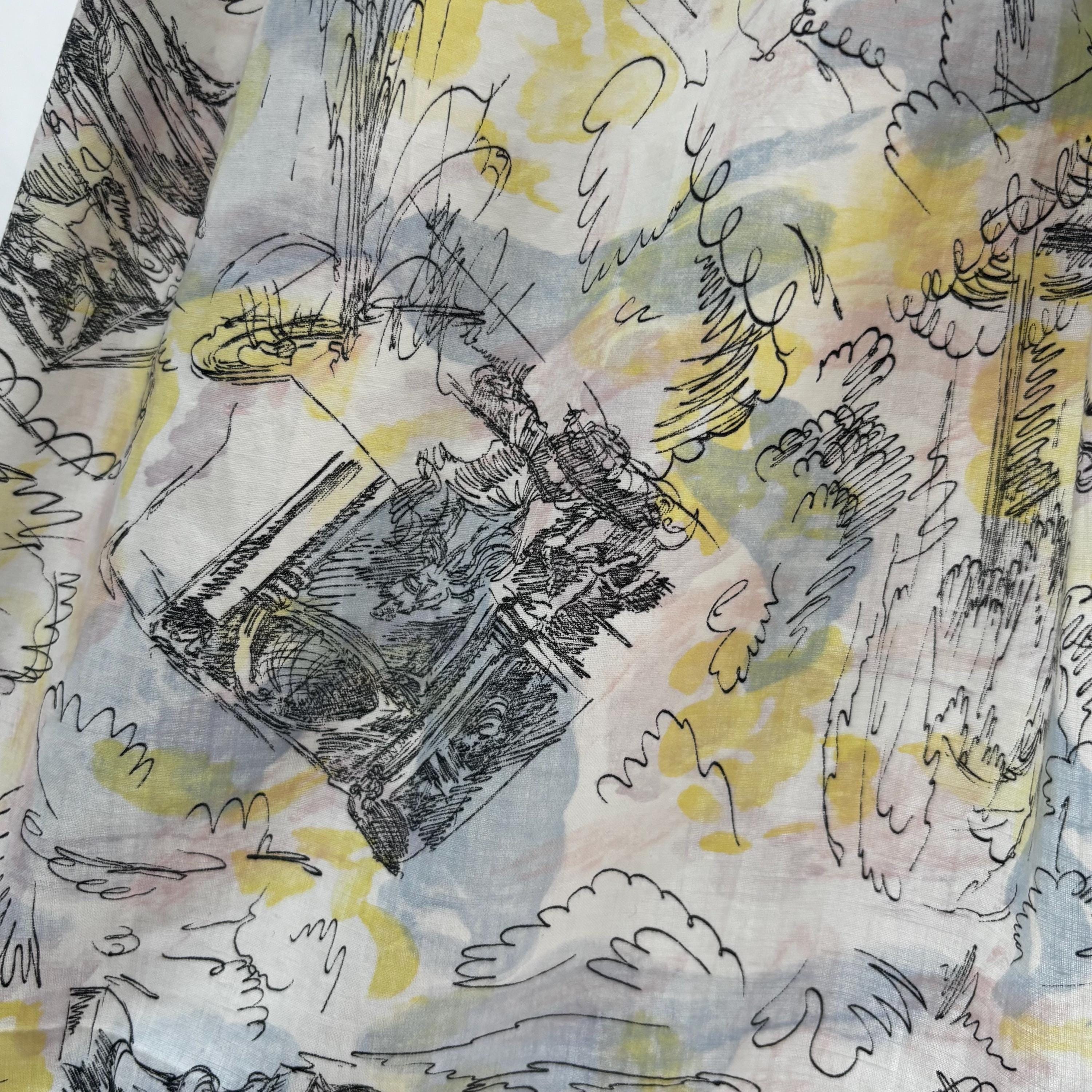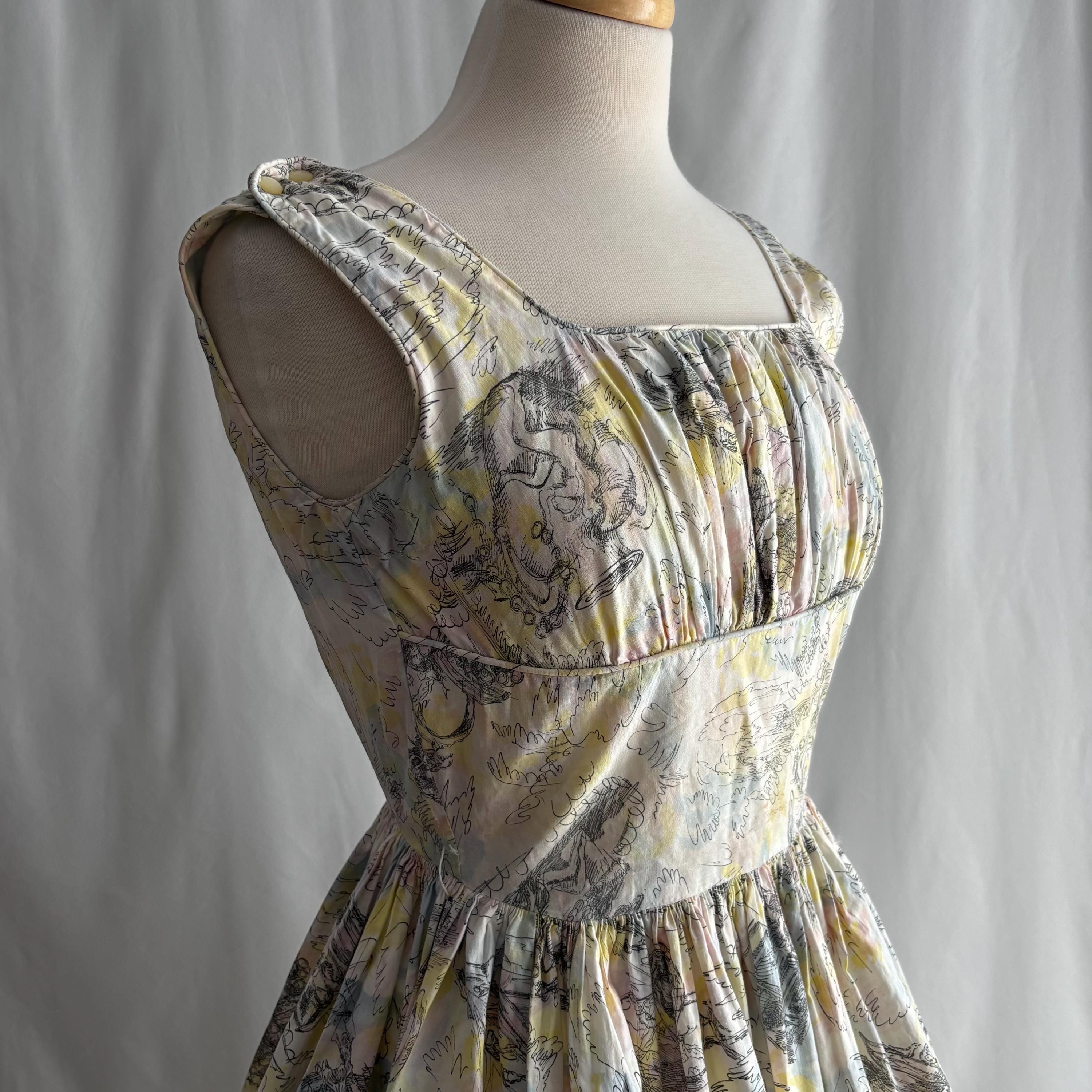 A really special 1960s vintage dress! Even without the incredible print, the dress is stunning. Starting at the top... the shoulders each have two buttons to close. The gathered bust sits atop an empire waist, with a snug fit through the body to the true waist. The skirt gathers at the waist and falls to roughly below knee length. I have pictured it here with a petticoat (not included) for volume. The dress closes at the back with a metal zipper and hook and eye. But the print! The fabric feels like cotton, and features a pink, blue and yellow pastel watercolour swirl, with sketches of Mediterranean scenes. Buildings, fountains, pottery and more. An absolute treasure! Please see the measurements for best fit.