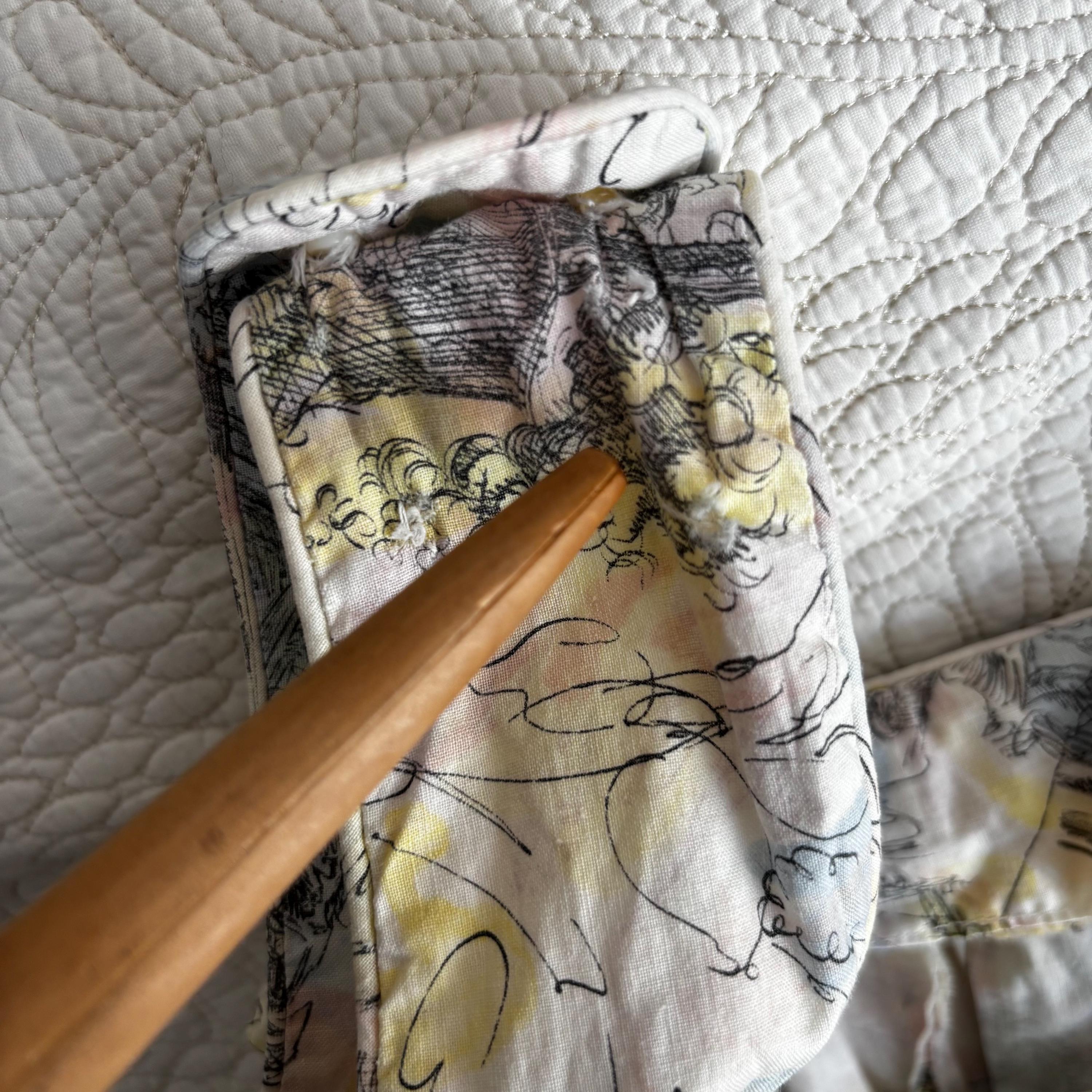 Vintage, good condition overall, with some notes. This has been dearly loved, but has held up remarkably well for 60 years. The label and some interior seam edges are worn, not visible from the outside. One of the buttons on the left shoulder is a bit paler than the others, presumably newer. There are a couple of speckled rust stains: at the waist, near the left underarm, and on the skirt. There was a small tear, which the previous owner repaired by hand. Every time I go to look for it, it takes me ages to find it, because the print is so good at hiding things. I opted not to take it apart and redo it, because it's so hard to find already. The rust marks at the waist are front and centre, and may or may not bother you. Please have a good look at the photos!