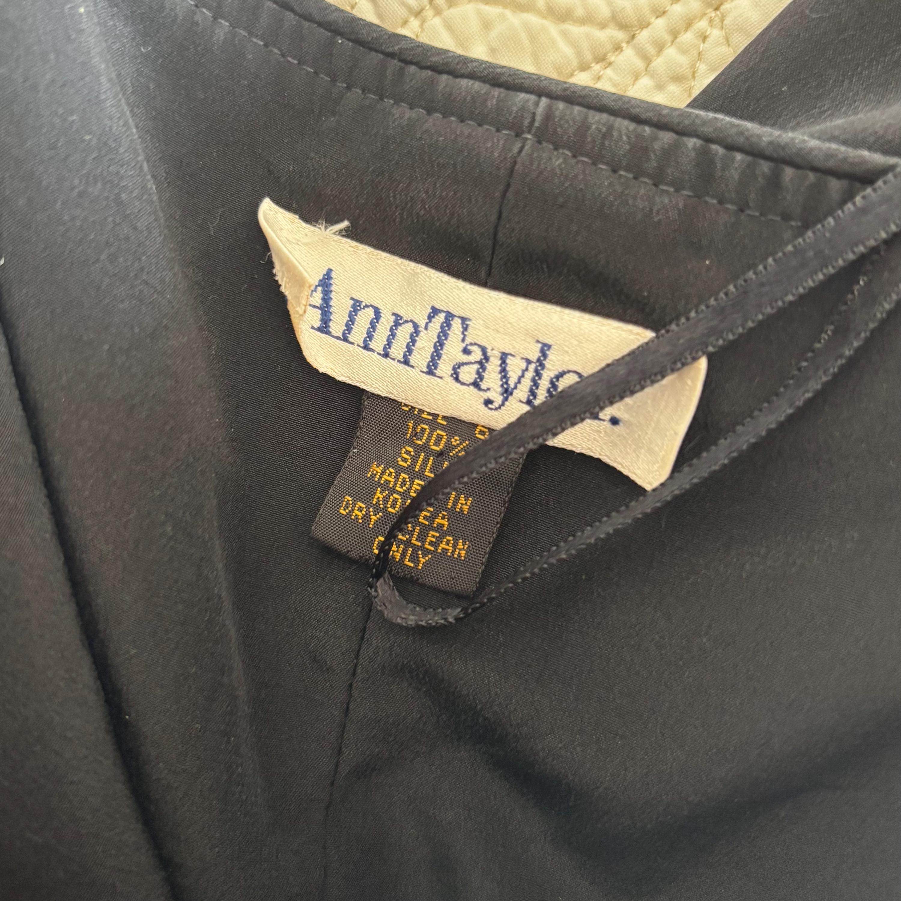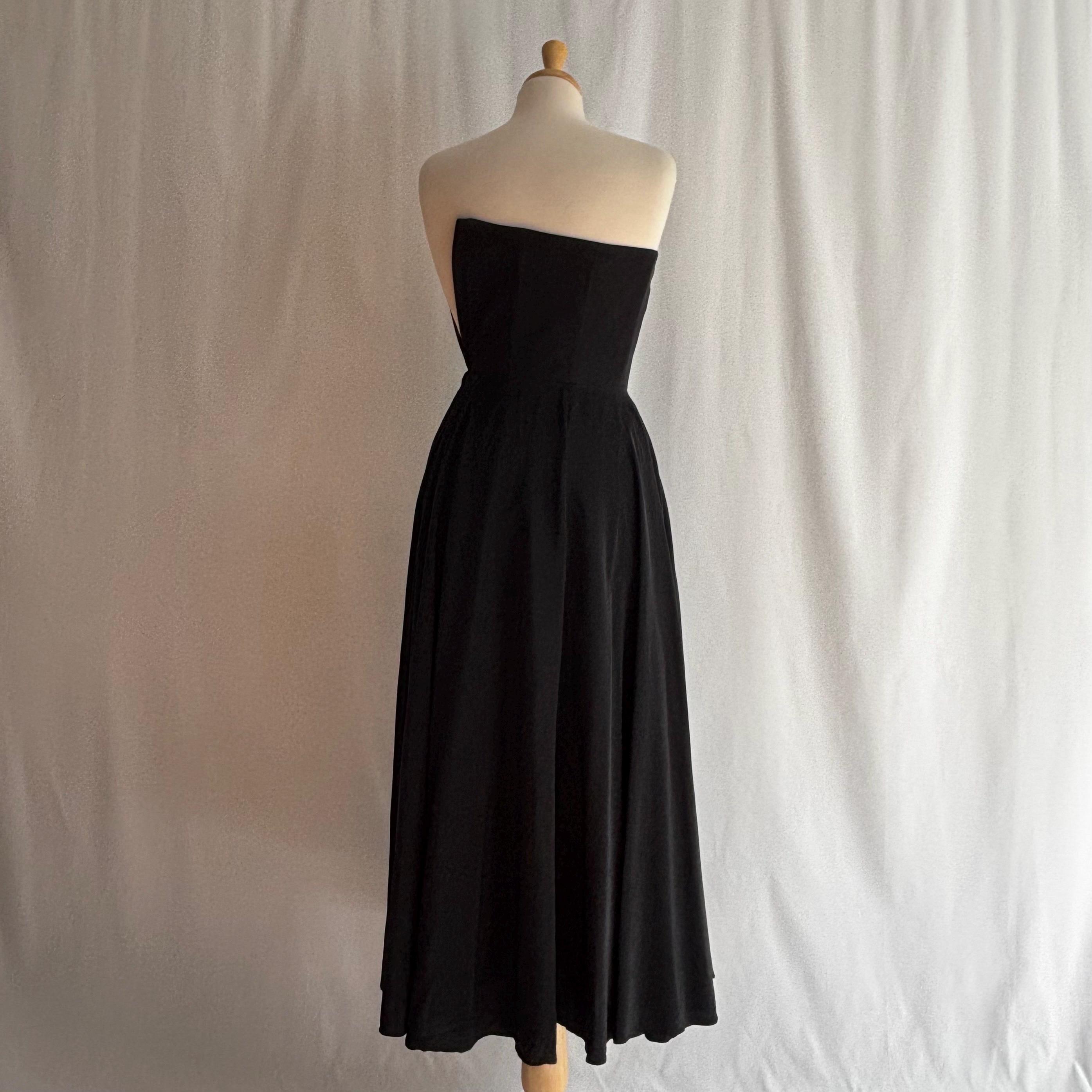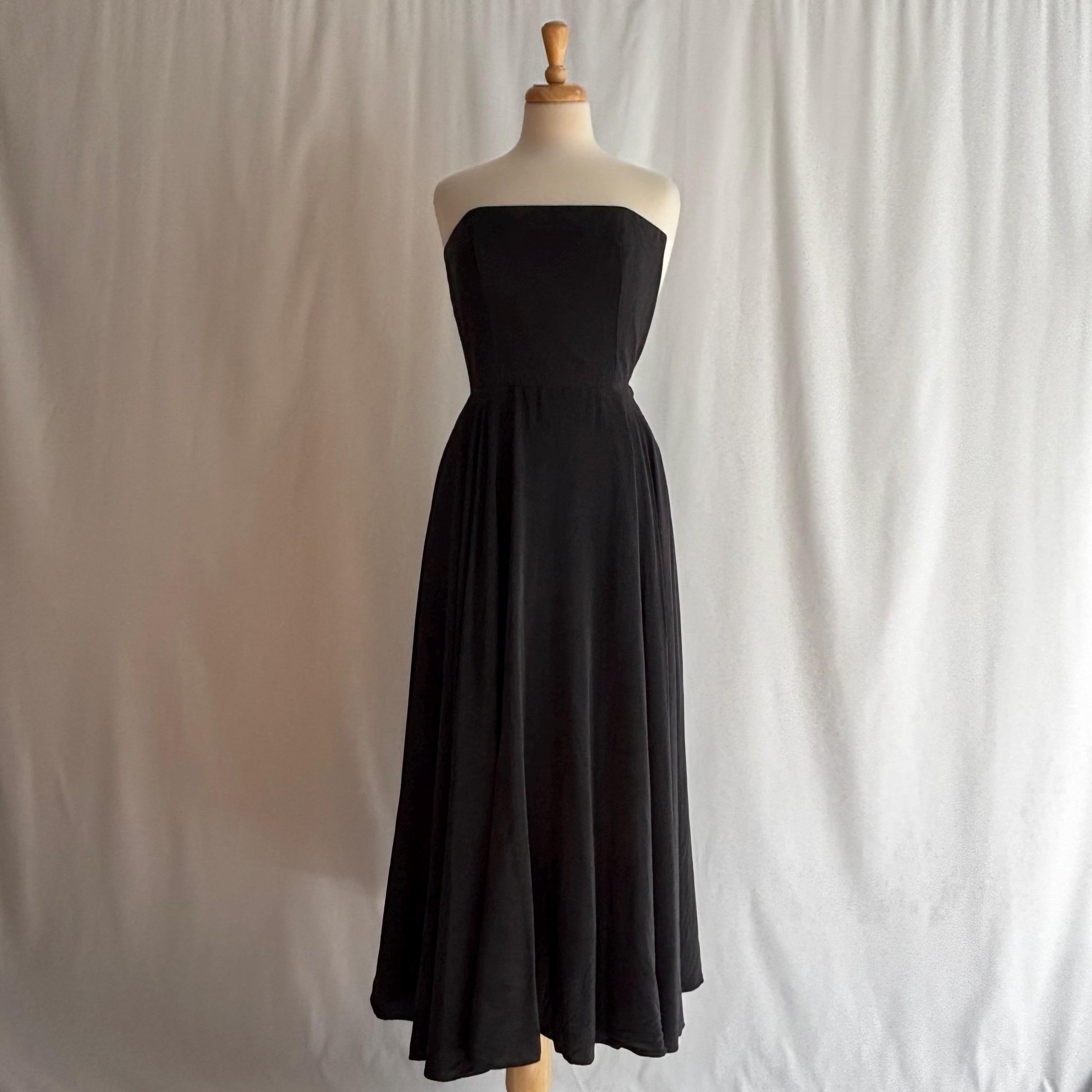 The Little Black Dress of my dreams! Vintage 90s Ann Taylor strapless dress. 100% silk, through and through. The top is boned for support. The skirt is full and voluminous. A hidden zipper at the side closes you in. Yes, there are pockets. Absolutely gorgeous! 100% silk, made in Korea. Size 6, but please see the measurements for best fit. (It was too small for my dress form, please pardon the open zipper!)